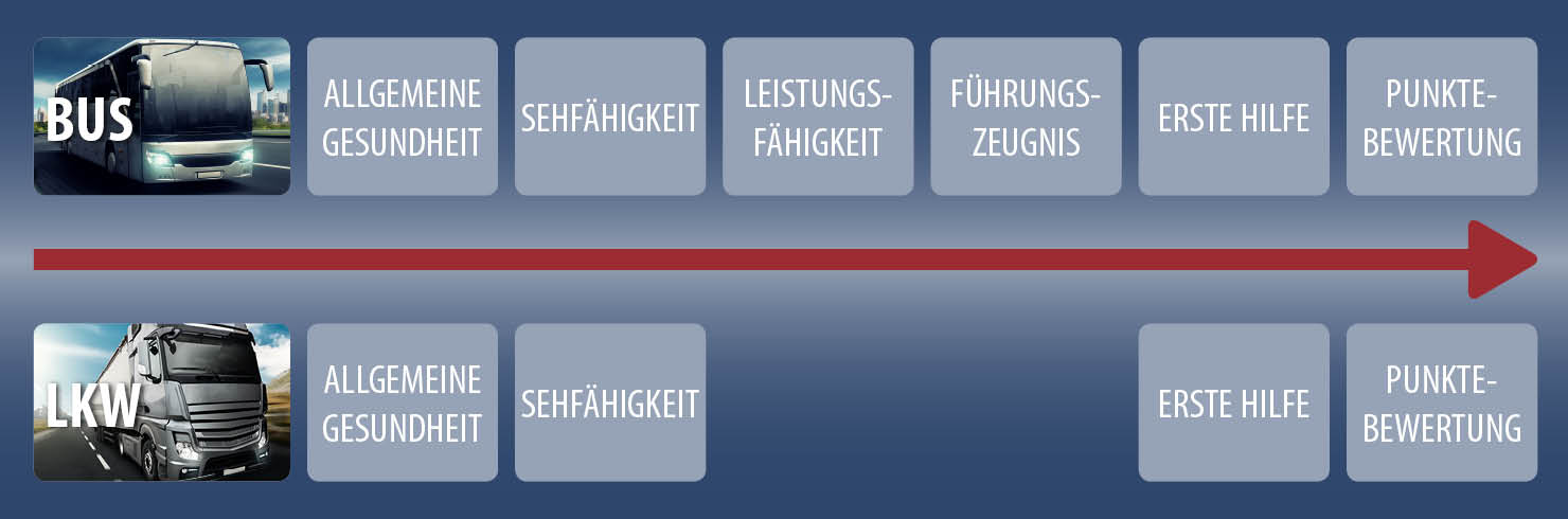 Es darf keine Erkrankung vorliegen, die die Eignung zum Führen eines solchen Kraftfahrzeuges ausschließt. Die Untersuchung beinhaltet eine ärztliche und eine augenärztliche Untersuchung. Für die Klassen D und die Personenbeförderung ist zusätzlich noch eine Leistungsuntersuchung vorgeschrieben.